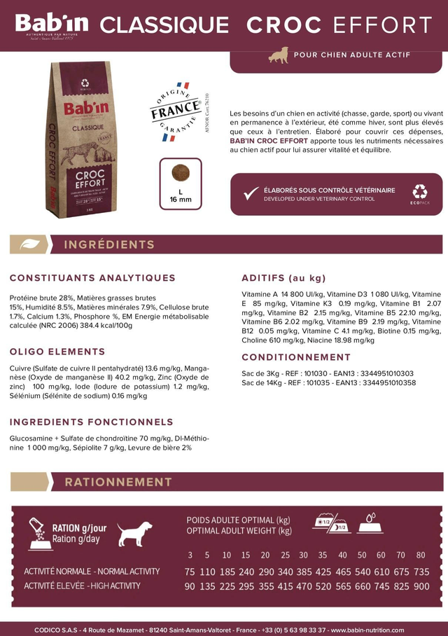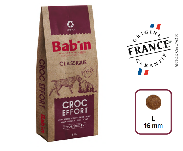Les besoins d’un chien en activité (chasse, garde, sport) ou vivant en permanence à l’extérieur, été comme hiver, sont plus élevés que ceux à l’entretien. Élaboré pour couvrir ces dépenses, BAB’IN CROC EFFORT apporte tous les nutriments nécessaires au chien actif pour lui assurer vitalité et équilibre